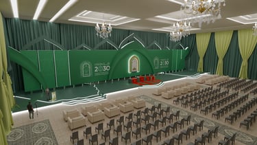 تصميم ثلاثي الأبعاد للفعاليات، والأجنحة والمعارض، مع أنظمة بصرية جاهزة للتنفيذ الفعلي.